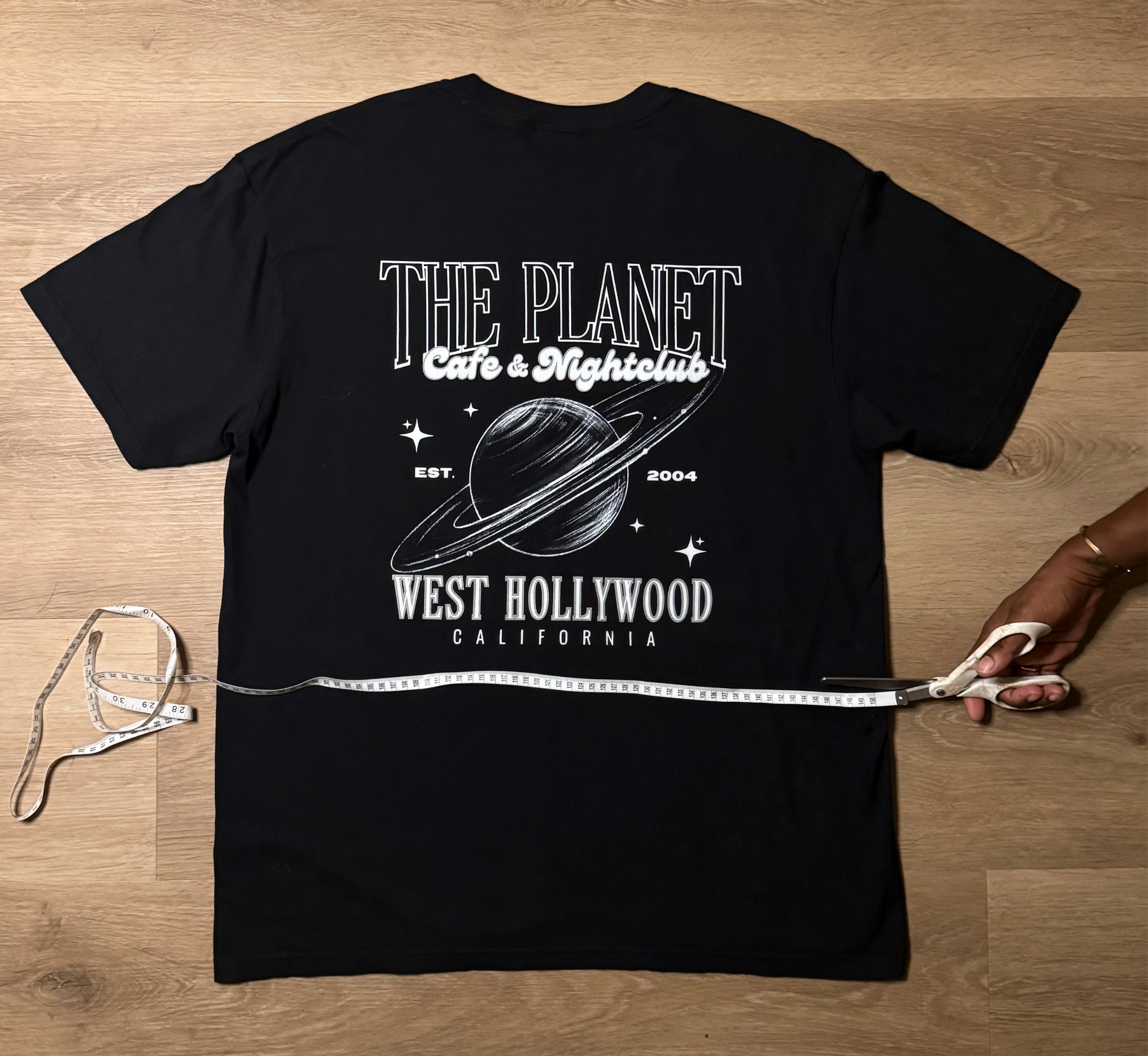 Black T-shirt with white printed design of a planet with rings and stars, text reads "The Planet Cafe & Nightclub, Est. 2004, West Hollywood, California." Someone is measuring the shirt with a measuring tape on a wooden floor.