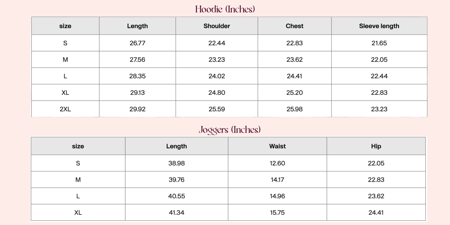 Sizing Note: You’ll be prompted to choose hoodie + sweatpants sizes after clicking Add to Cart.